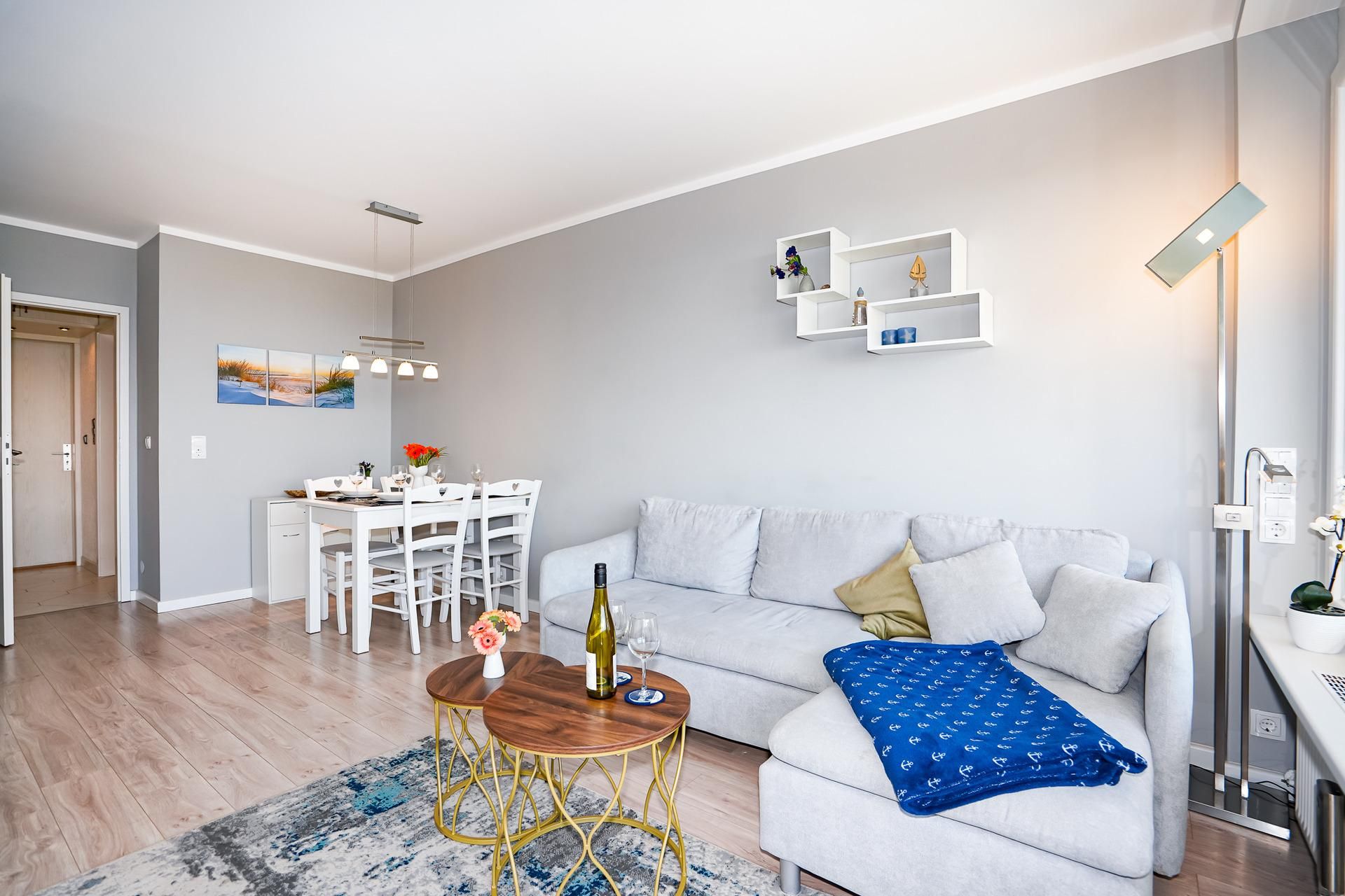 Das gepflegte und ruhig gelegene Apartment hat eine Größe von etwa 40 Quadratmetern und bietet bis zu 4 Urlaubsgästen Platz. Der Wohnraum verfügt über einen Essbereich sowie über eine bequeme Polsterlandschaft, von der aus die Lieblingsserie auf einem großen Flachbildfernseher verfolgt werden. Das helle Schlafzimmer ist mit einem bequemen Doppelbett (2 x 80 x200) ausgestattet. Die moderne Küche gibt Gelegenheit, eigene Mahlzeiten zuzubereiten. Das Badezimmer ist mit einer Dusche ausgestattet. Der mit wetterfesten Gartenmöbeln versehene Balkon bietet neben der Möglichkeit im Freien zu Frühstücken auch eine Aussicht auf die Lübecker Bucht. Eine Balkonverglasung lädt auch im Winter zum verweilen auf dem Balkon ein.