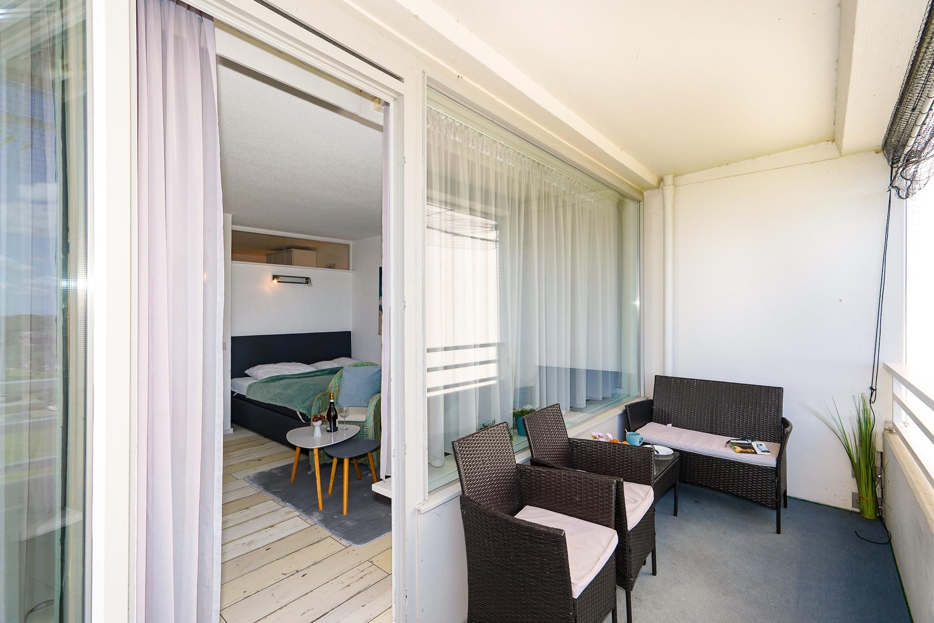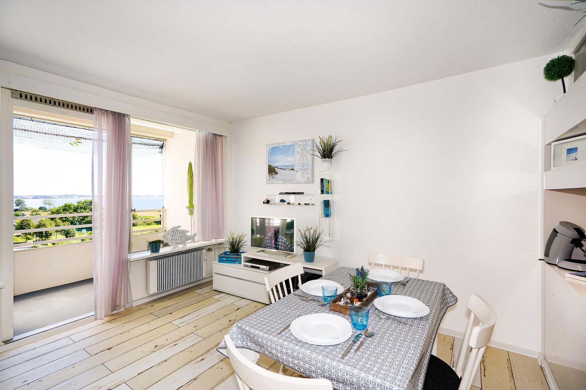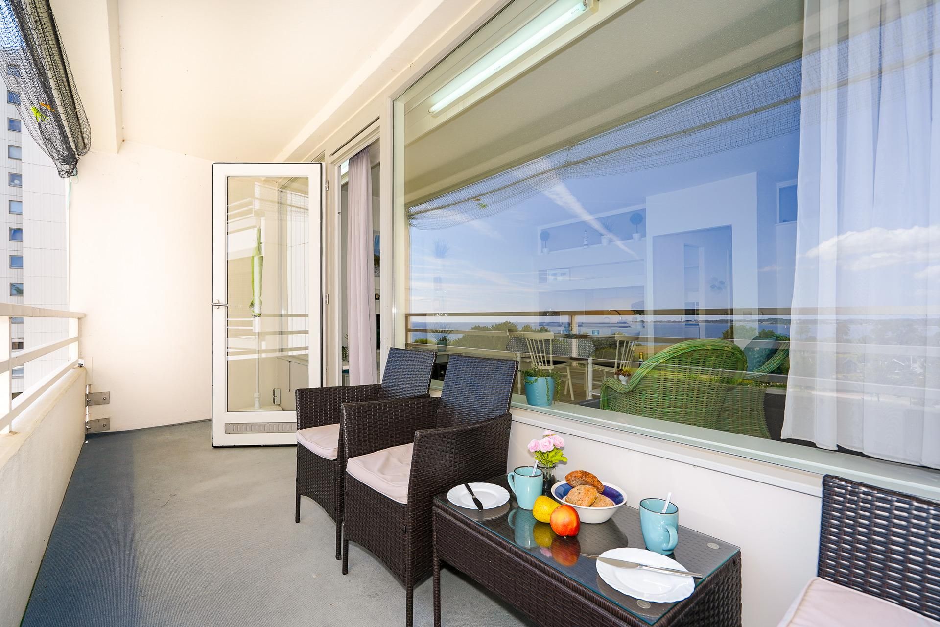 Über einen Fahrstuhl kann die in der 4. Etage gelegene Wohnung bequem erreicht werden. In dem hellen und gemütlich eingerichteten Wohnzimmer ist eine moderne Küche integriert. Diese enthält neben allen Kochutensilien auch eine komfortable Spülmaschine. Eine Essecke, eine...